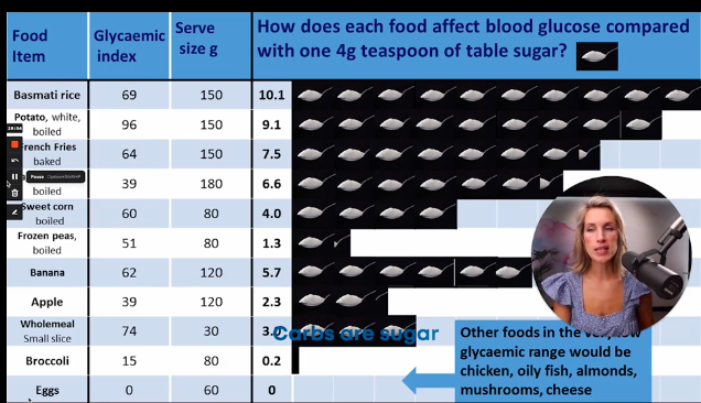 (This is a screenshot from the Primal Bod curriculum where you learn about how certain foods affect your body. Foods we thought to be healthy may well be causing our bodies to struggle. To have balanced blood sugar, you only need to have 1 teaspoon of sugar in your blood!)